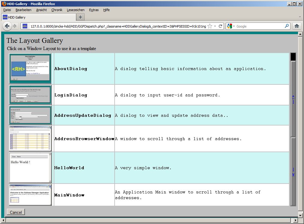 There is no need to know (much) about HTML to utilize the tool. The ReinHTML Dialog Designer generates a HTML file that implements a dialog form and triggers CGI scripts (for instance in Perl) that process input data and react on user interactions. For instance you can specify for each button, which script should be called when the button is pressed (callback function).